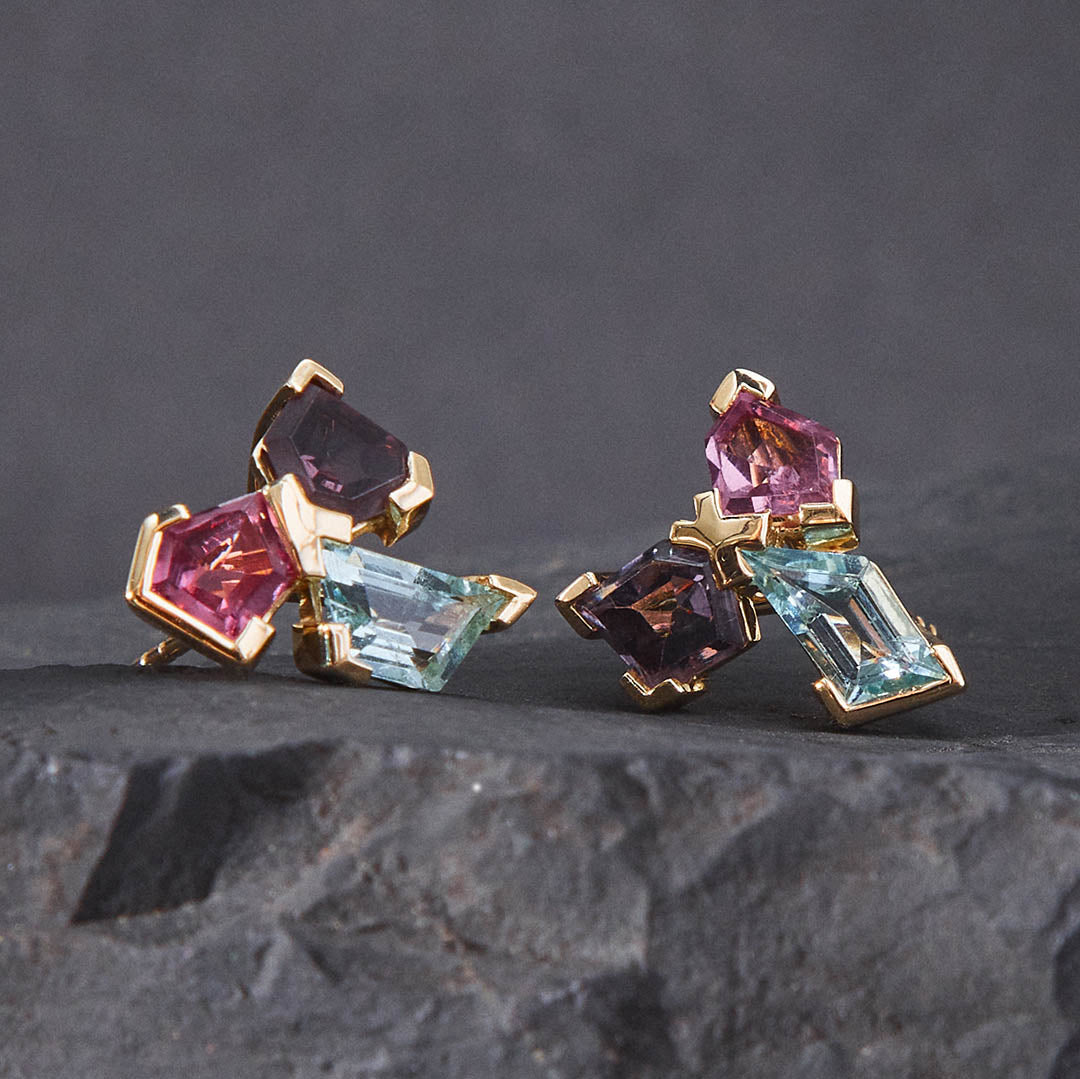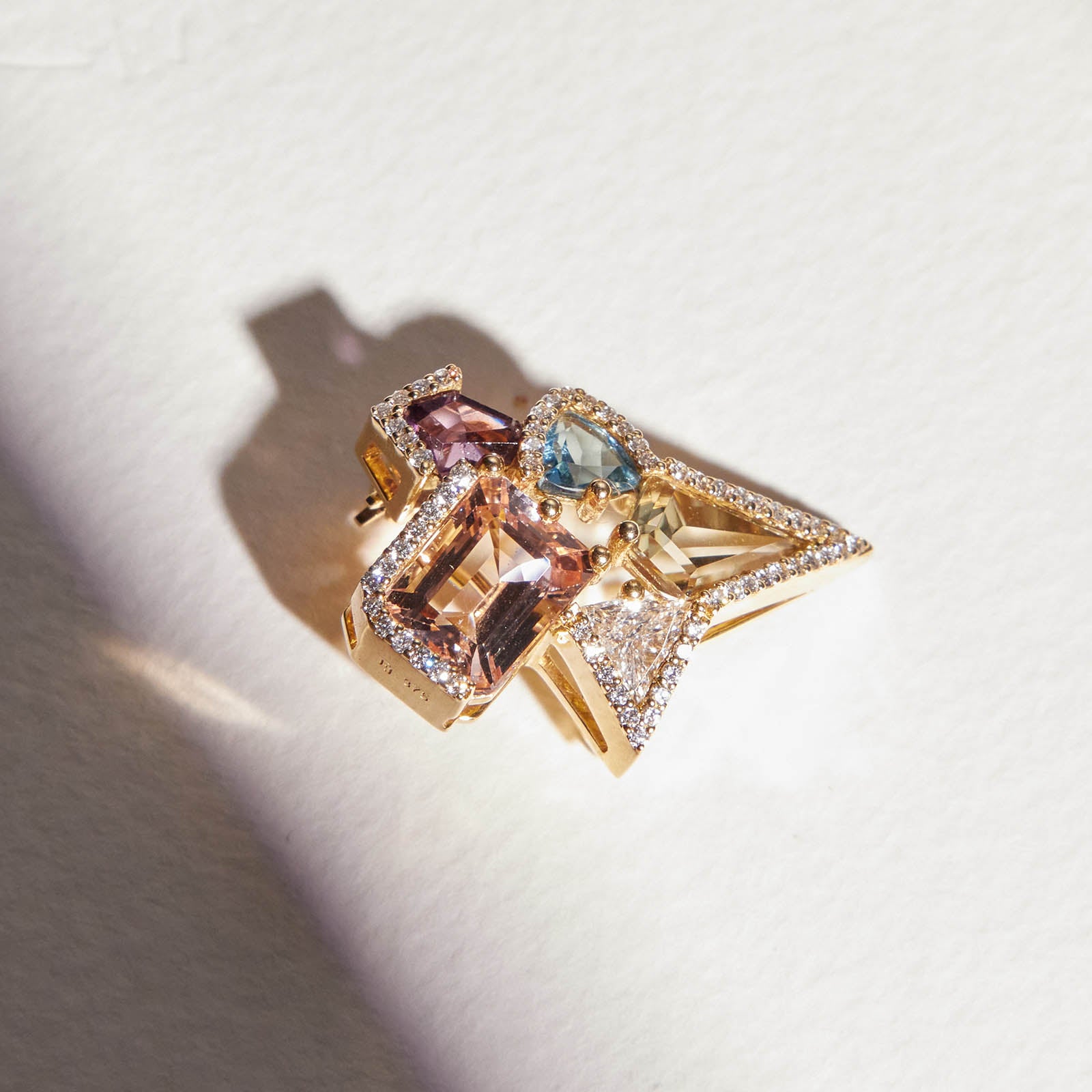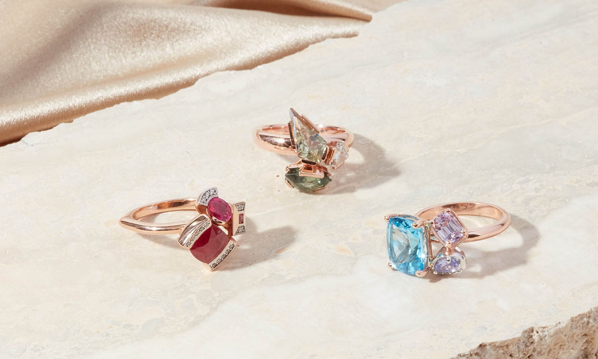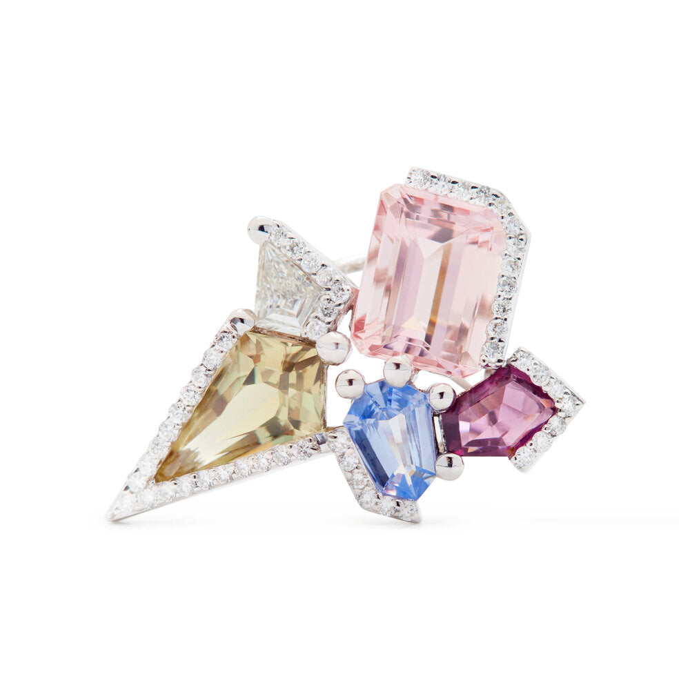 FAITH JEWELS' distinctive design style—a modern, linear interpretation of a floral arrangement. The design is bold and chic, punctuated by three key gemstones that together create the illusion of a vibrant, multi-hued bouquet.