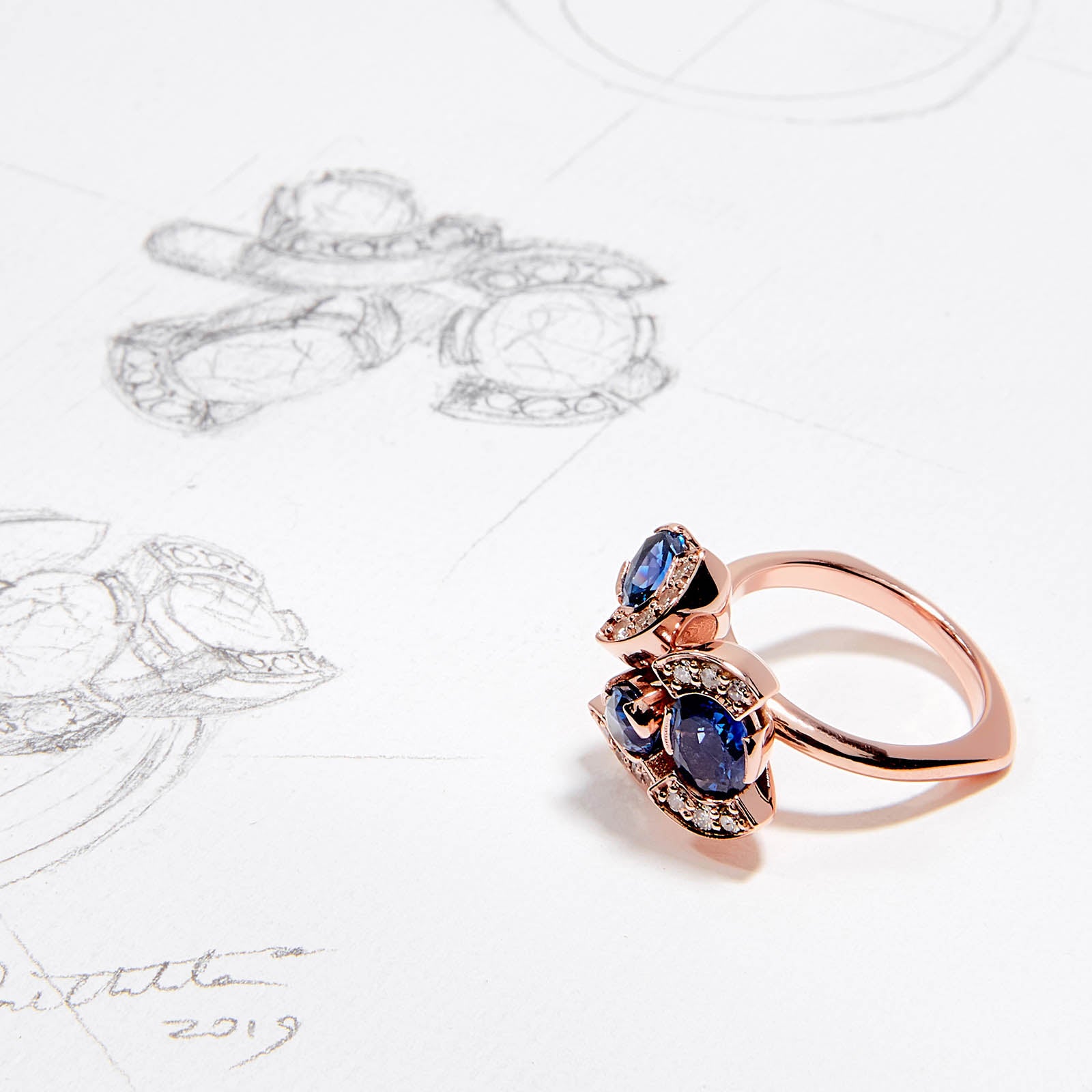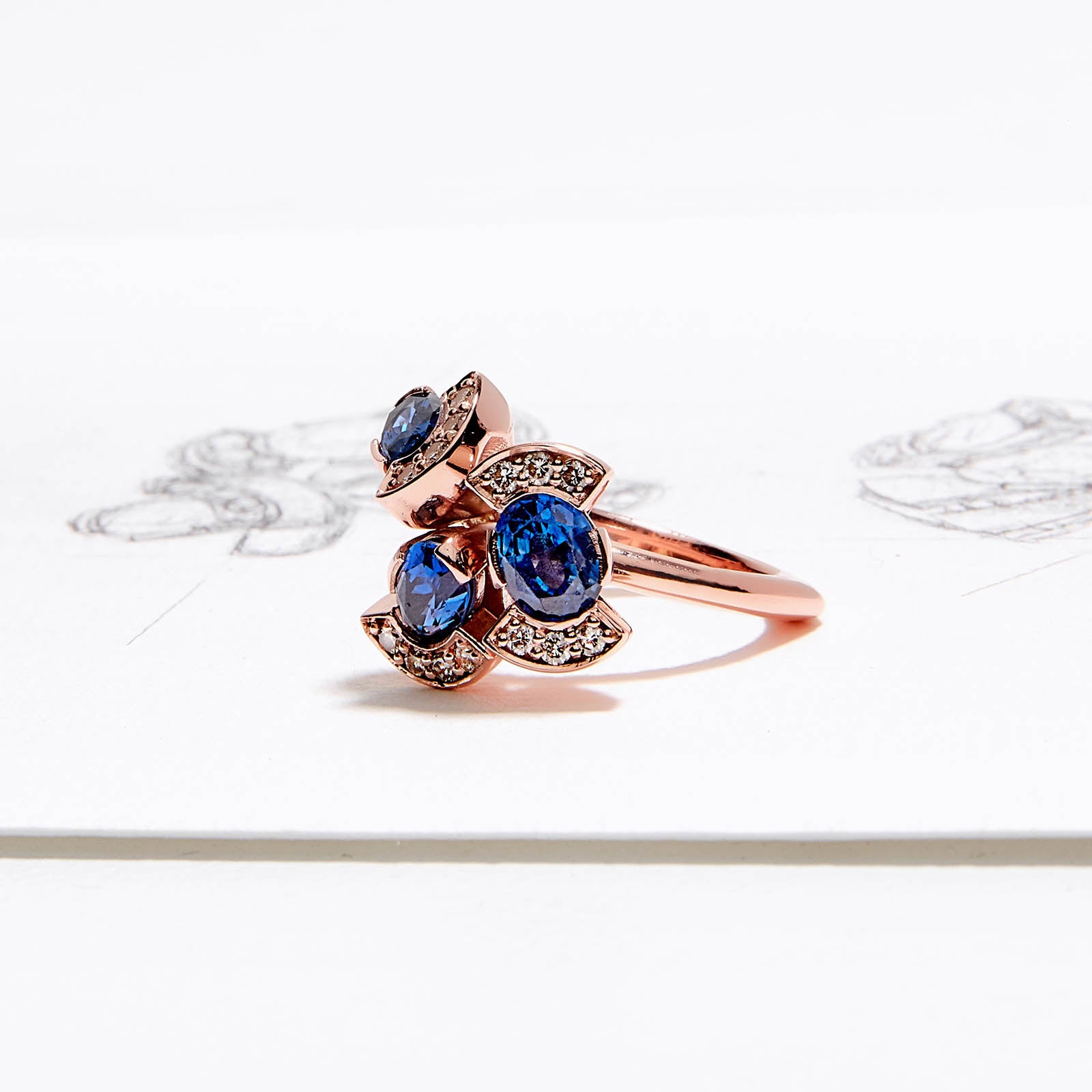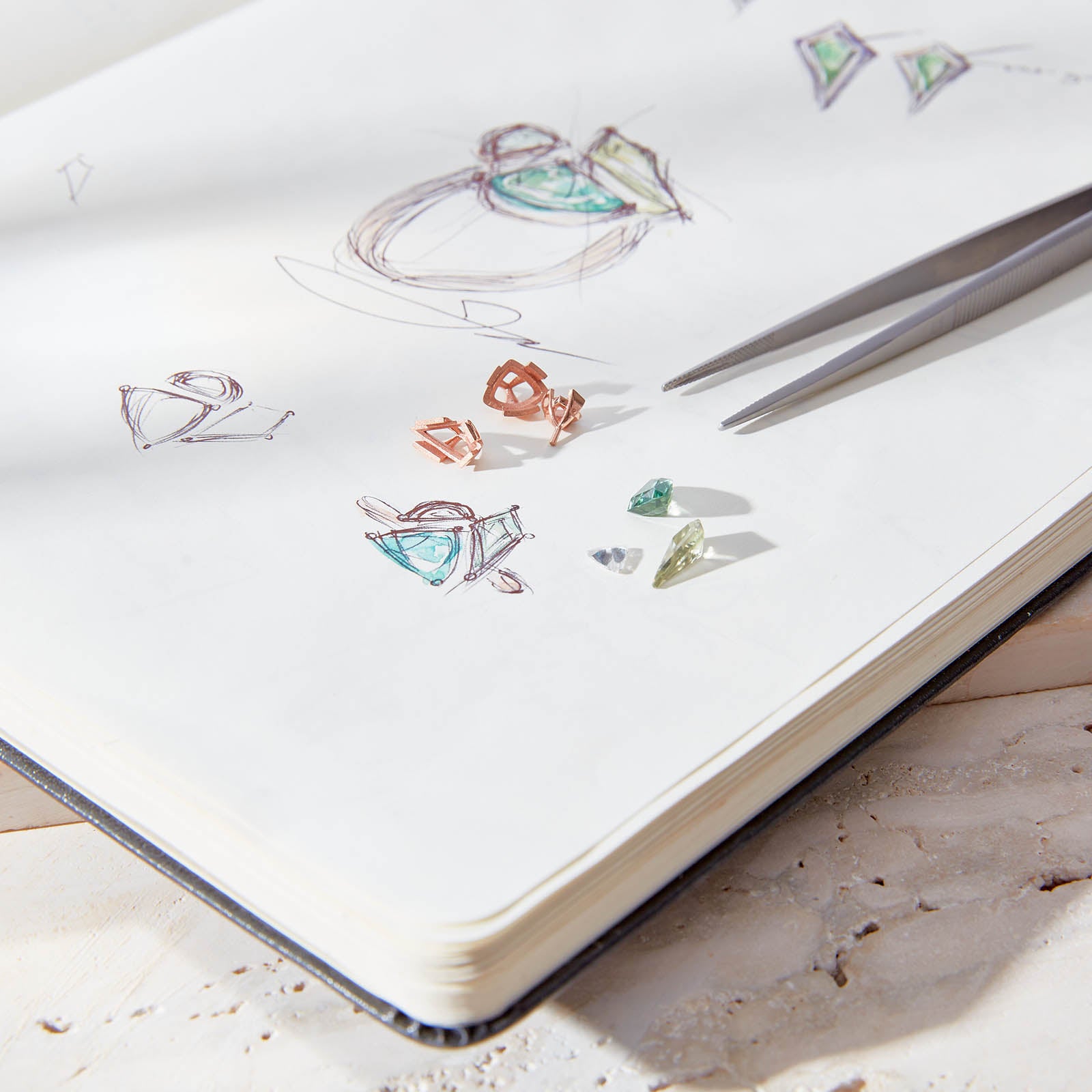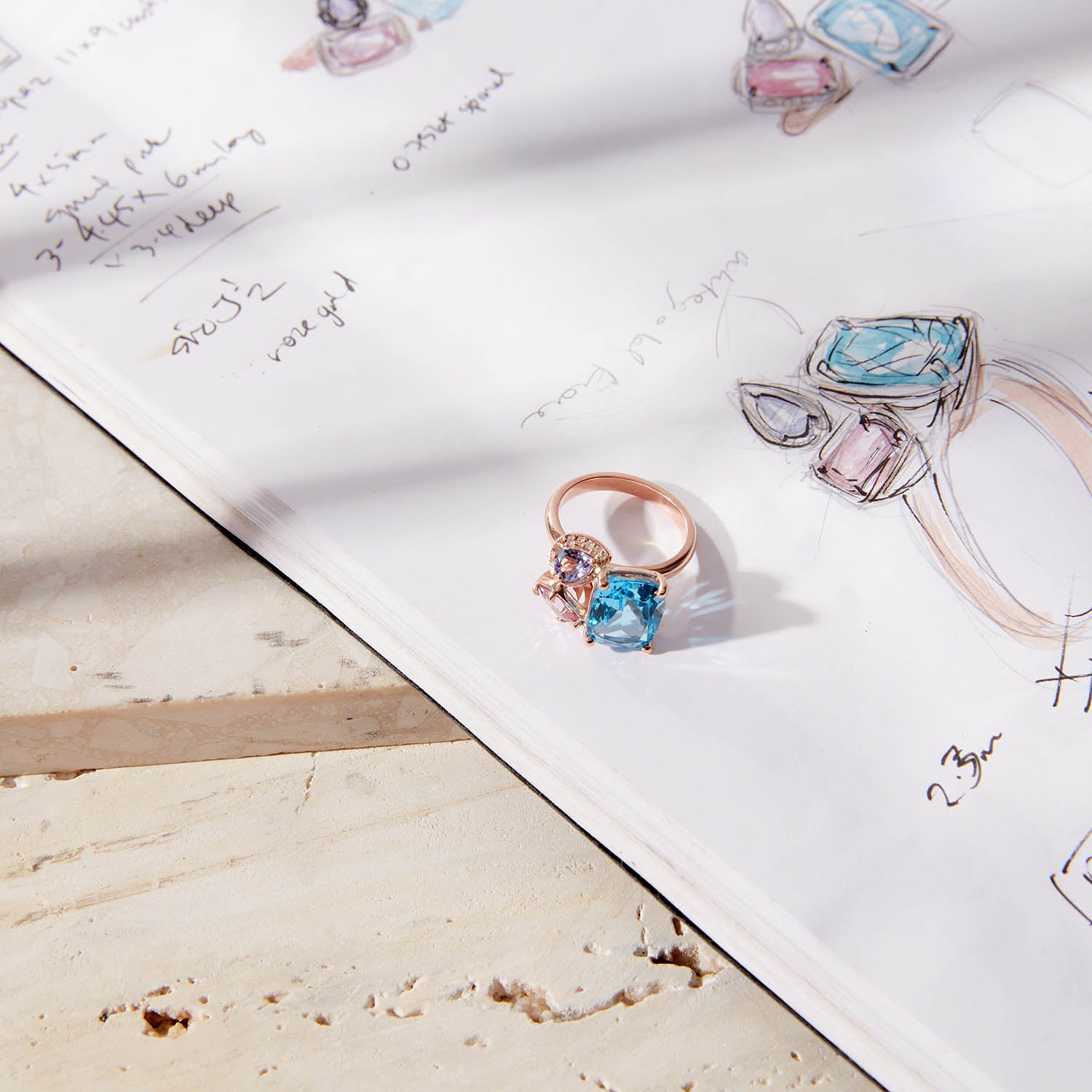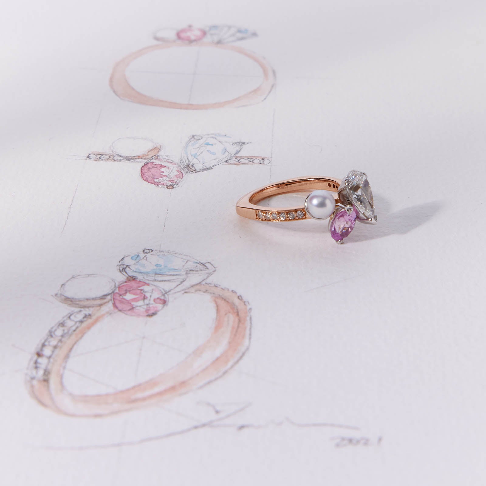 In a moment of inspiration sparked by a stunning bouquet of flowers, our Creative Director conceived a unique design, sketching a ring that combines three different colors and shapes within a single piece, diverging from the traditional approach of featuring a single gem across multiple jewels.
