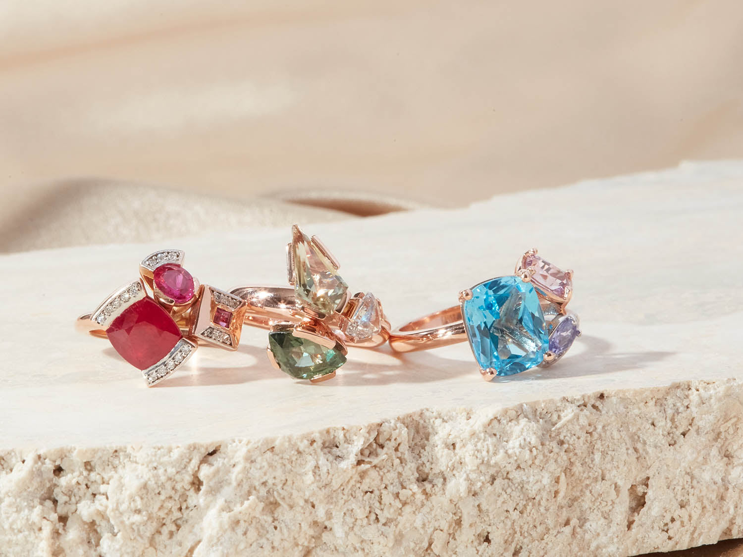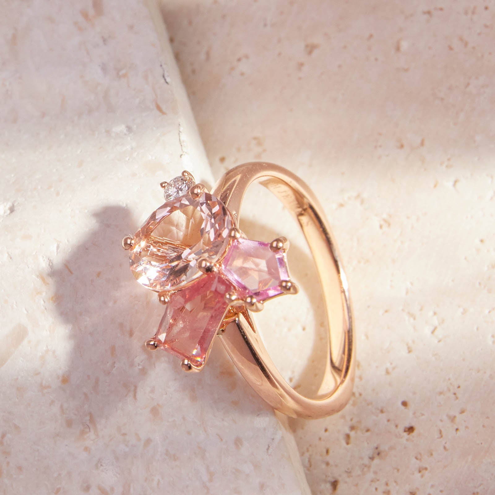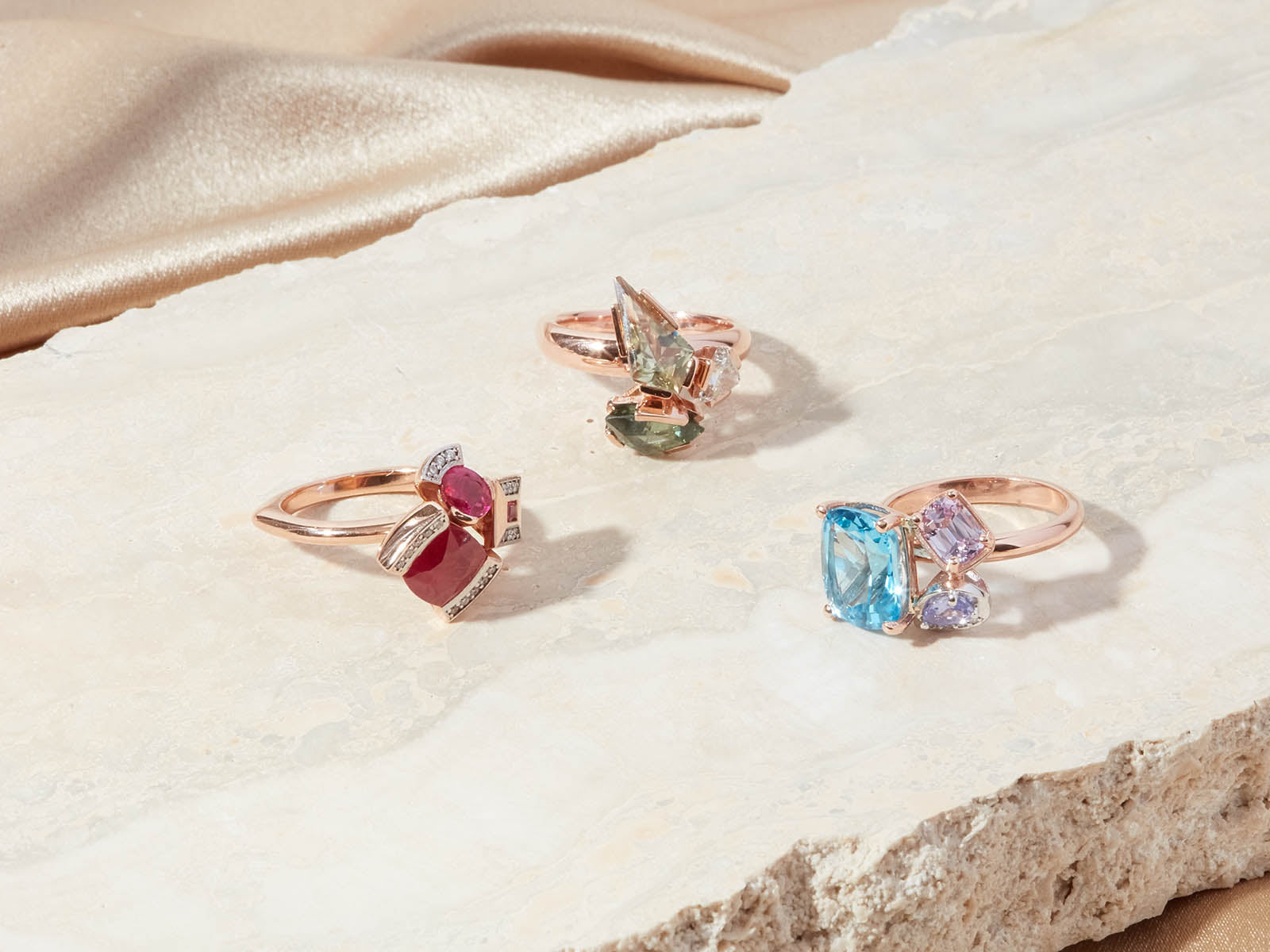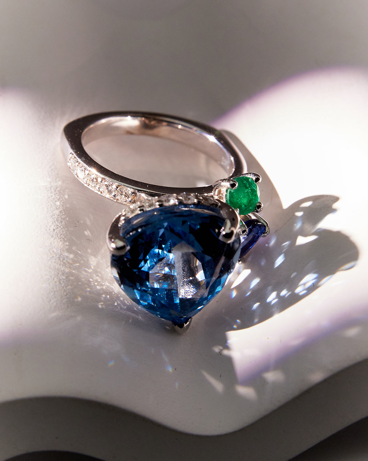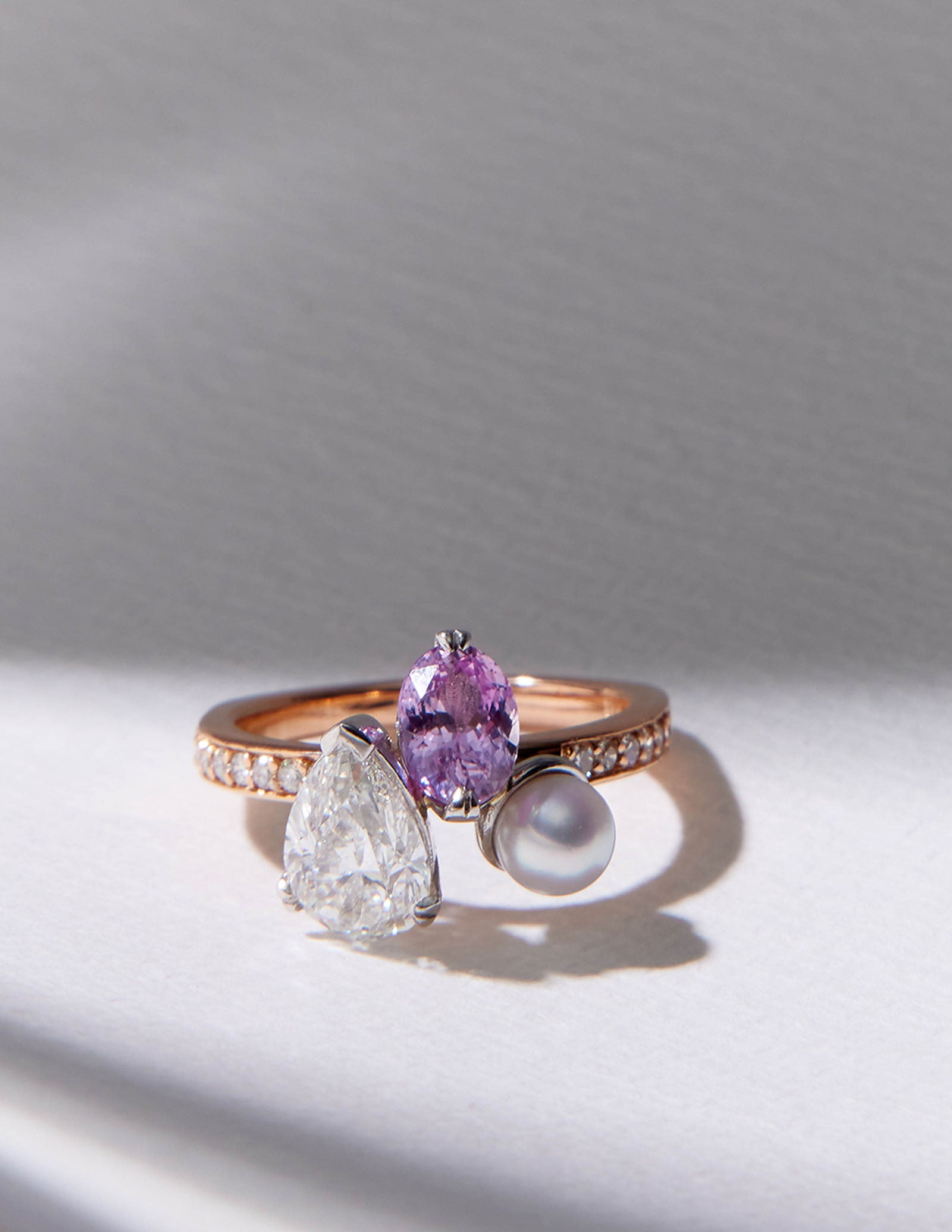 In a moment of inspiration sparked by a stunning bouquet of flowers, our Creative Director conceived a unique design, sketching a ring that combines three different colors and shapes within a single piece, diverging from the traditional approach of featuring a single gem across multiple jewels.