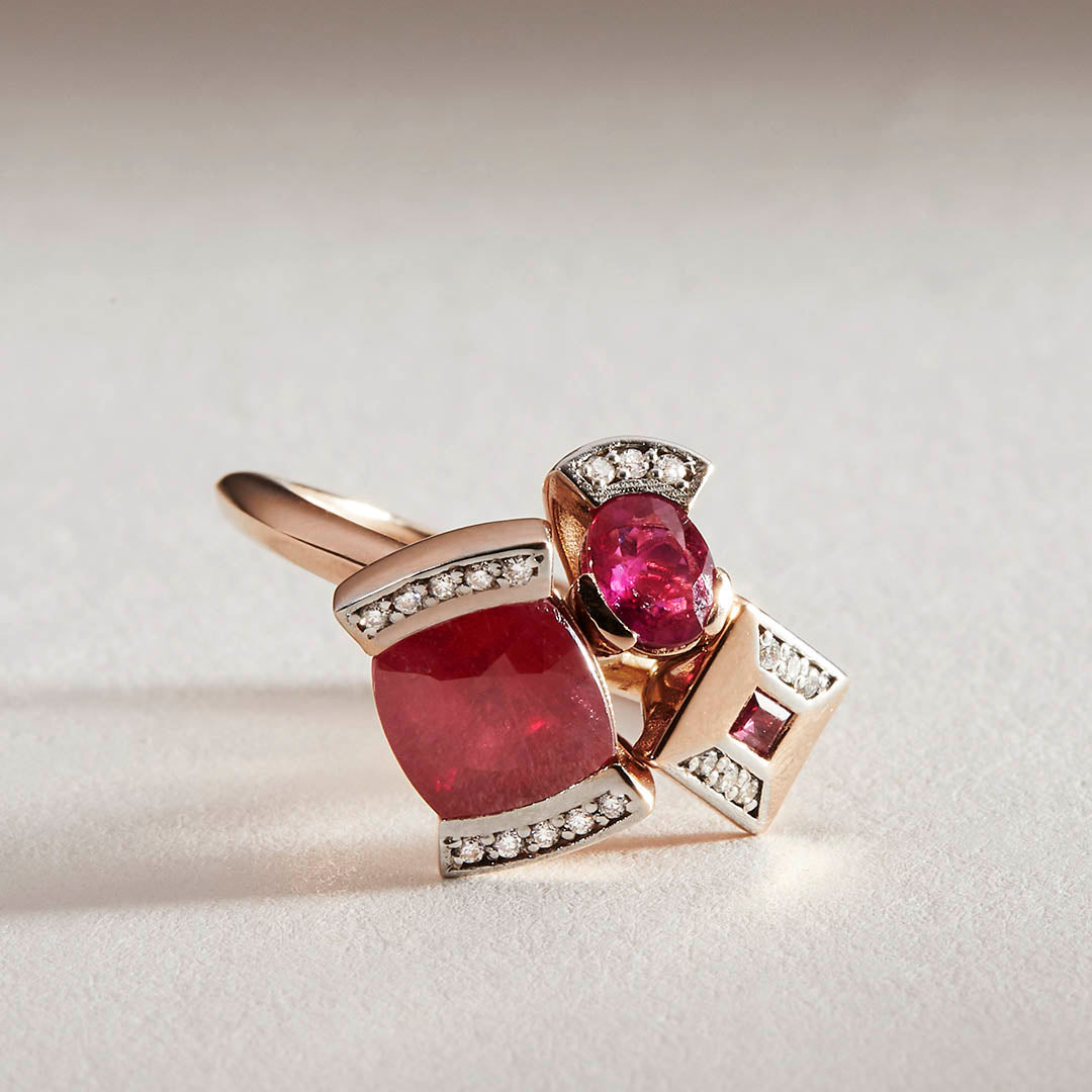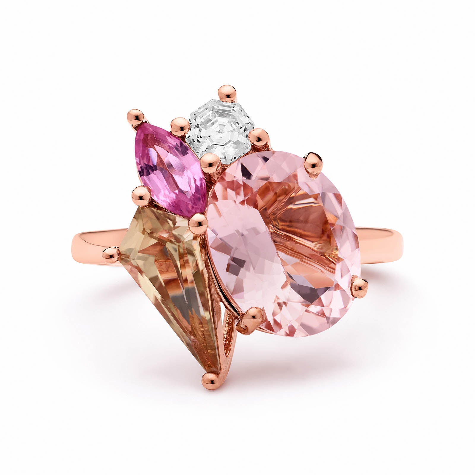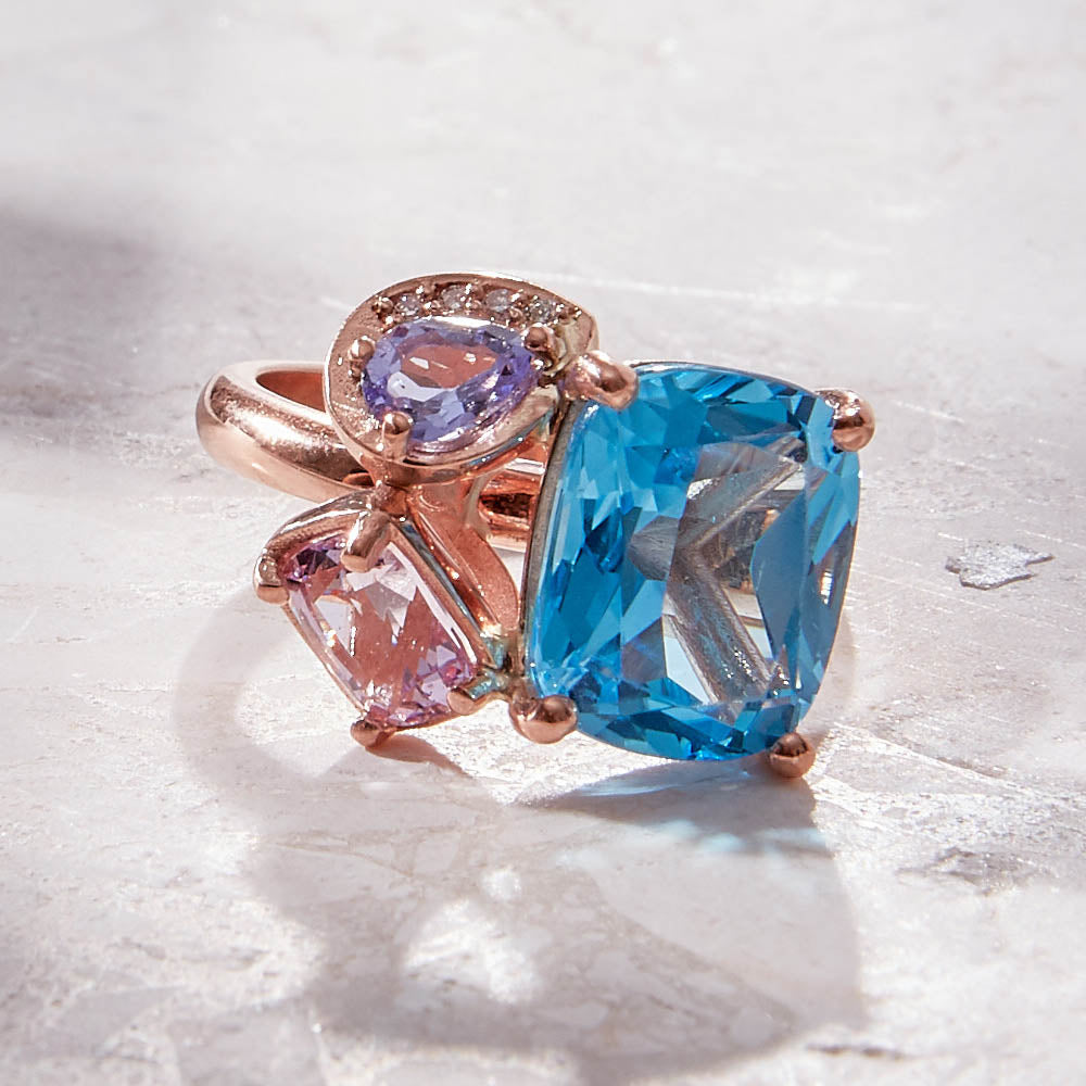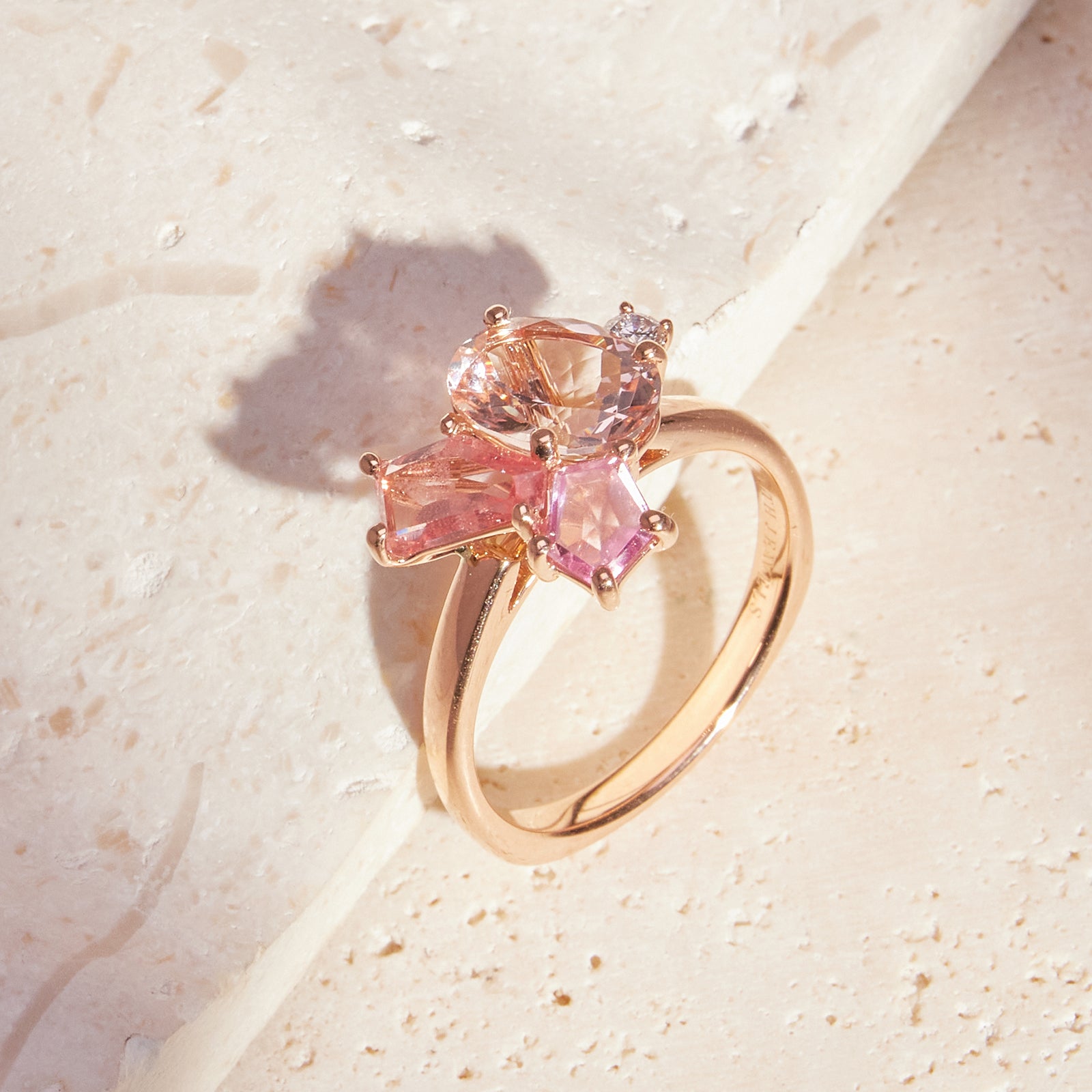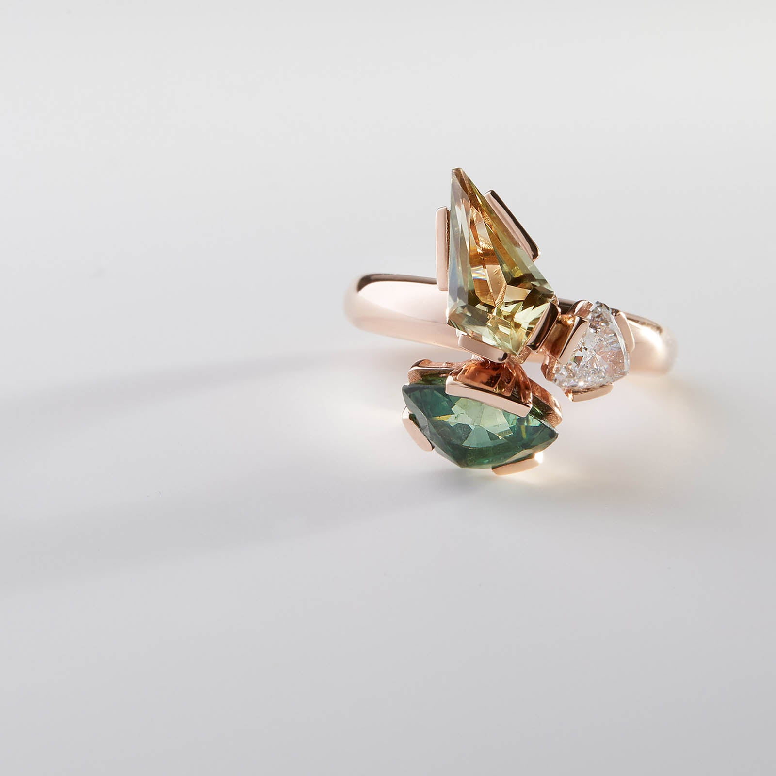 In a moment of inspiration sparked by a stunning bouquet of flowers, our Creative Director conceived a unique design, sketching a ring that combines three different colors and shapes within a single piece, diverging from the traditional approach of featuring a single gem across multiple jewels.