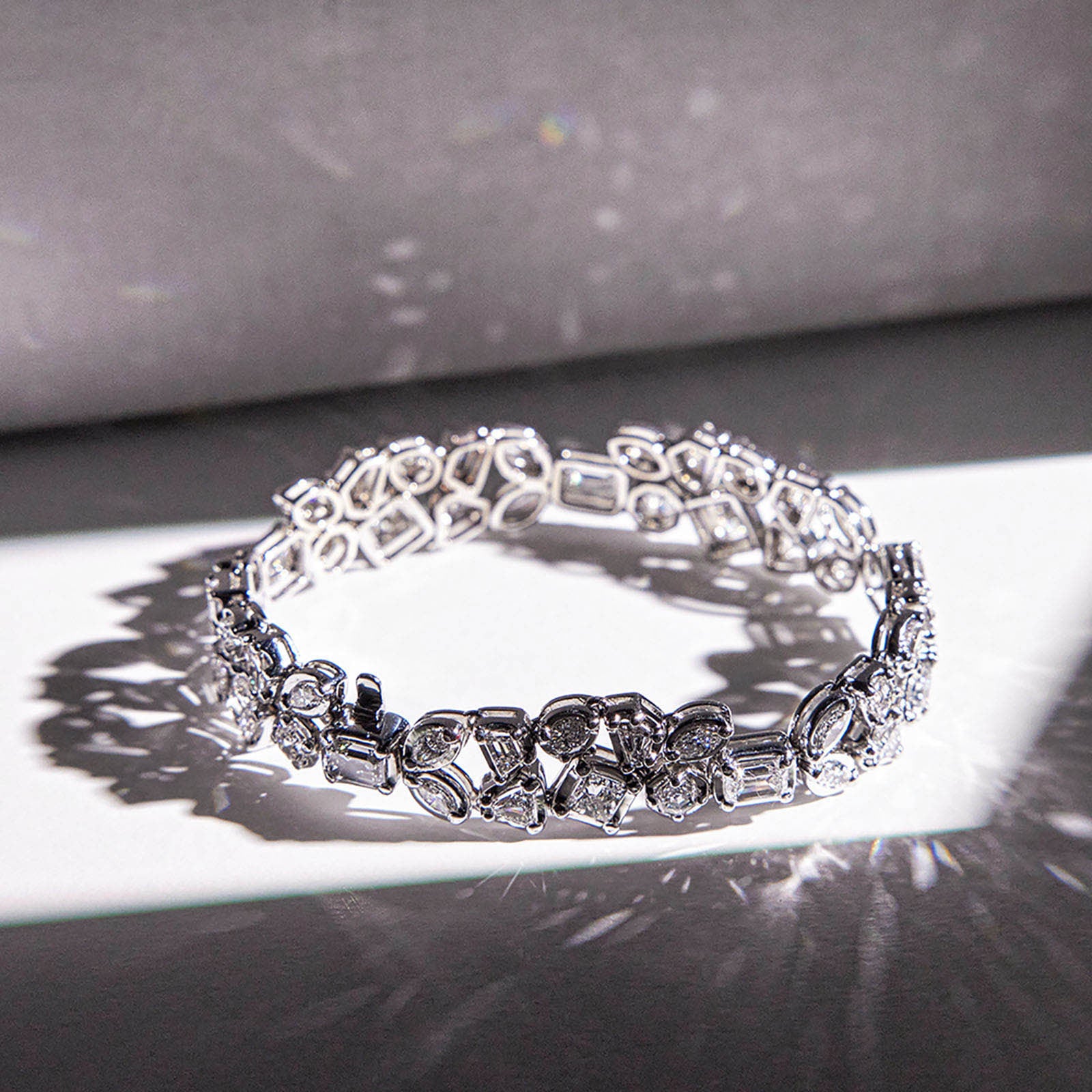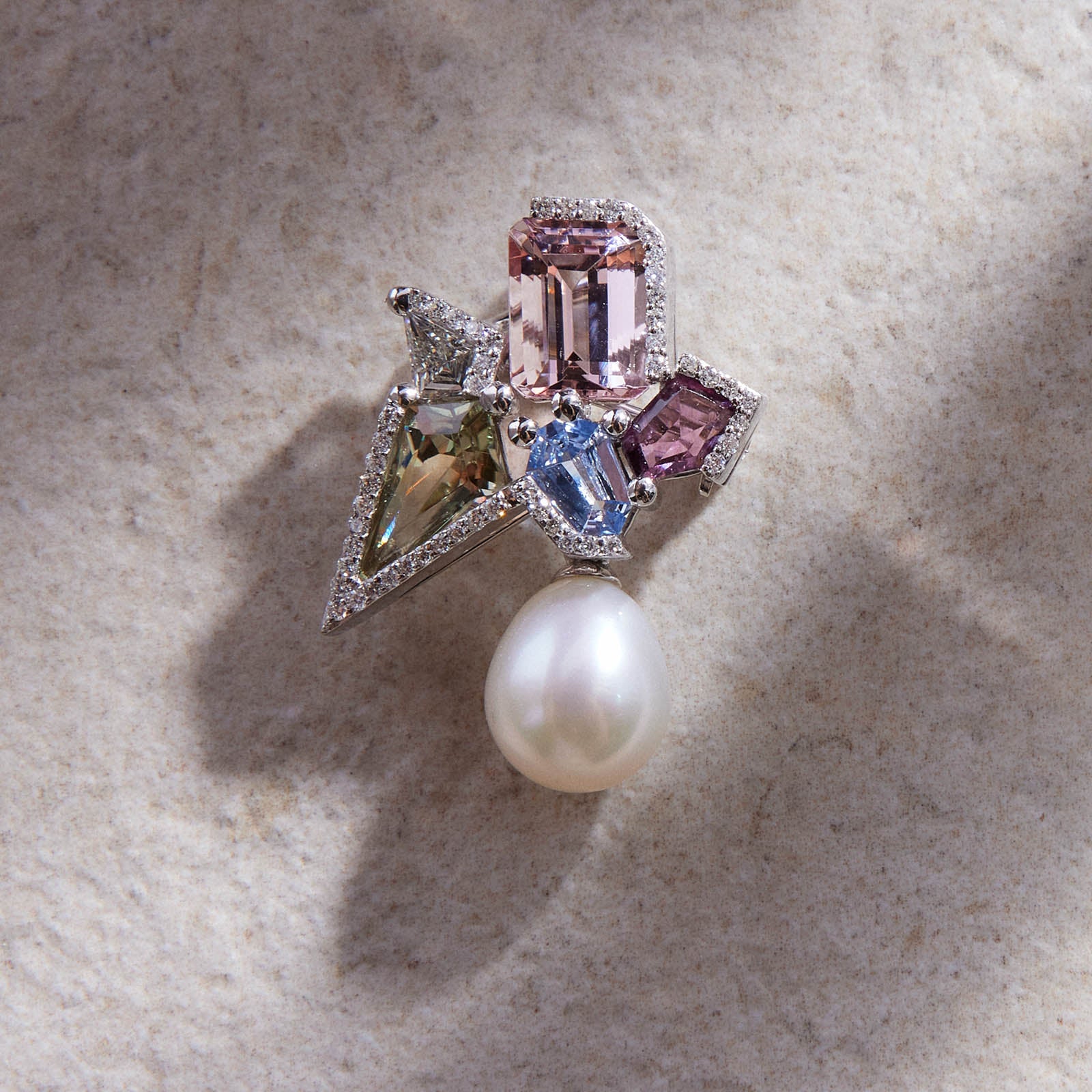 The FJ Bouquet collection now features multiple versions, each showcasing angular diamonds alongside precious and semi-precious colored gemstones. Every bouquet is uniquely crafted to reflect the wearer's personal taste and style.