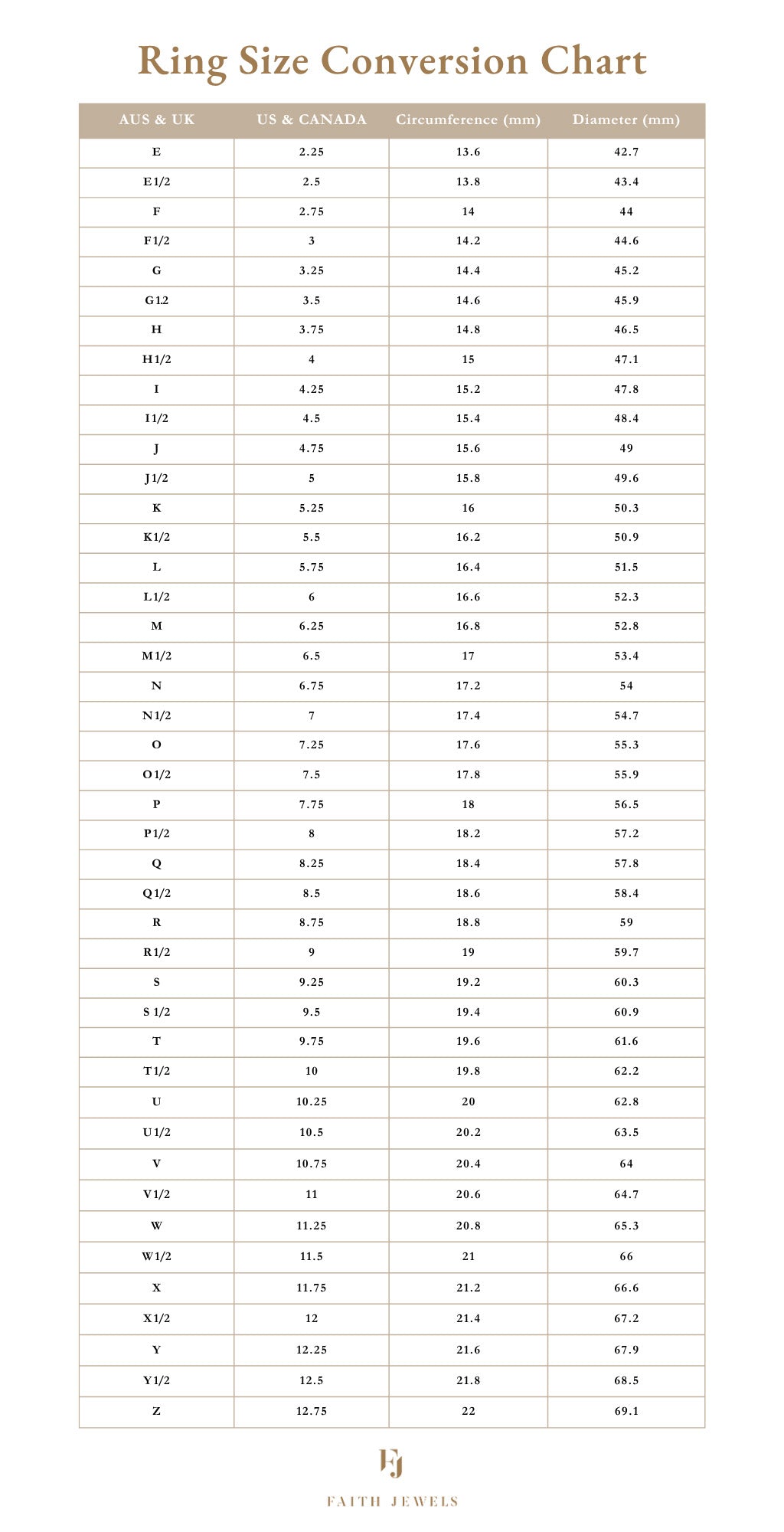 Every Faith Jewels creation is crafted to Australian standard sizing. If you know your size in European, American or diameter measurements, our conversion chart below makes it effortless to find your perfect Australian fit. A simple beginning to the creation of your bespoke Faith Jewels piece.